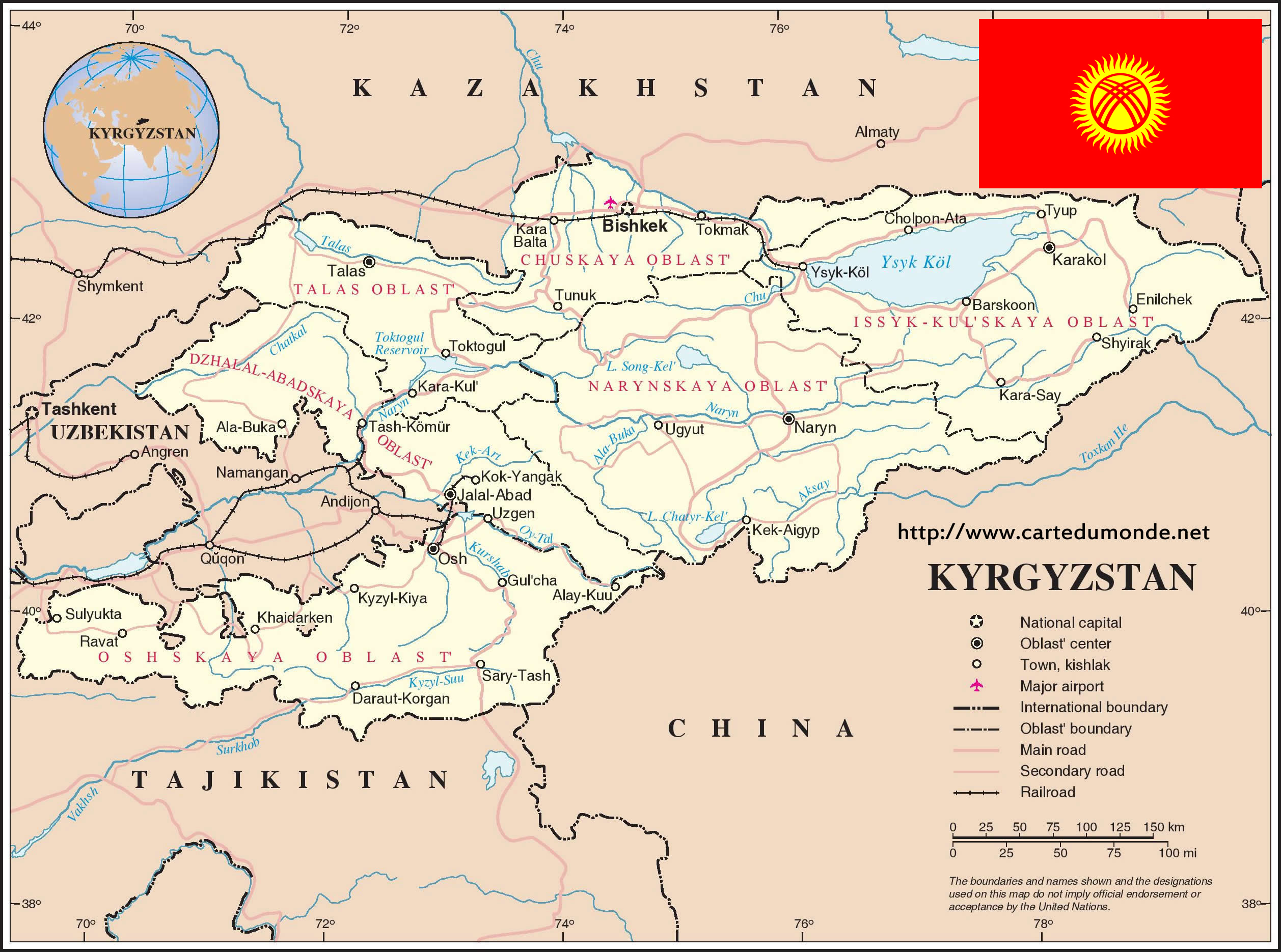 Geographie : 4,7 millions d’habitants. 200 000 km., soit 5 fois la Suisse mais les altitudes y sont nettement superieures (Pic Pobedy : 7 439 metres d’altitude, Pic Lenine : 7 134 metres d’altitude). 95 % du territoire est montagneux dont 30 % depassent les 3 000 metres. 6 500 km. de glaciers. La plus grande partie de la population du Kirghizstan vit dans la vallee de Ferghana au sud du pays, le reste est regroupe principalement autour de la capitale Bishkek et sur la rive nord du lac Issyk Koul. Le Kirghizstan est delimite par la Chine, le Kazakhstan, l’Ouzbekistan et le Tadjikistan.