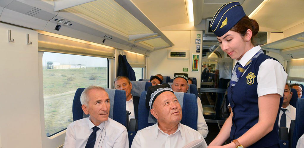 Il existe également des trains à plus grande vitesse. Le nouveau train à grande vitesse “Afrosiyob » est entré en service permanent entre Tachkent et Samarcande qui relie les deux villes en 2h10, à une vitesse pouvant atteindre 254 km/h! Il circule tous les jours. Le train (contient deux locomotives, huit voitures et un wagon-restaurant) est capable de transporter 215 passagers. Les voitures de voyageurs sont pourvues de sièges confortables, moniteurs vidéo et outils d’éclairage, disposent des espaces de rangement spéciaux pour vêtements et bagages. La température de l'air, l'itinéraires et la vitesse de circulation seront régulièrement retransmis aux voitures par des panneaux électroniques. Il convient de noter en particulier que le train a toutes les conditions nécessaires pour les voyageurs handicapés.