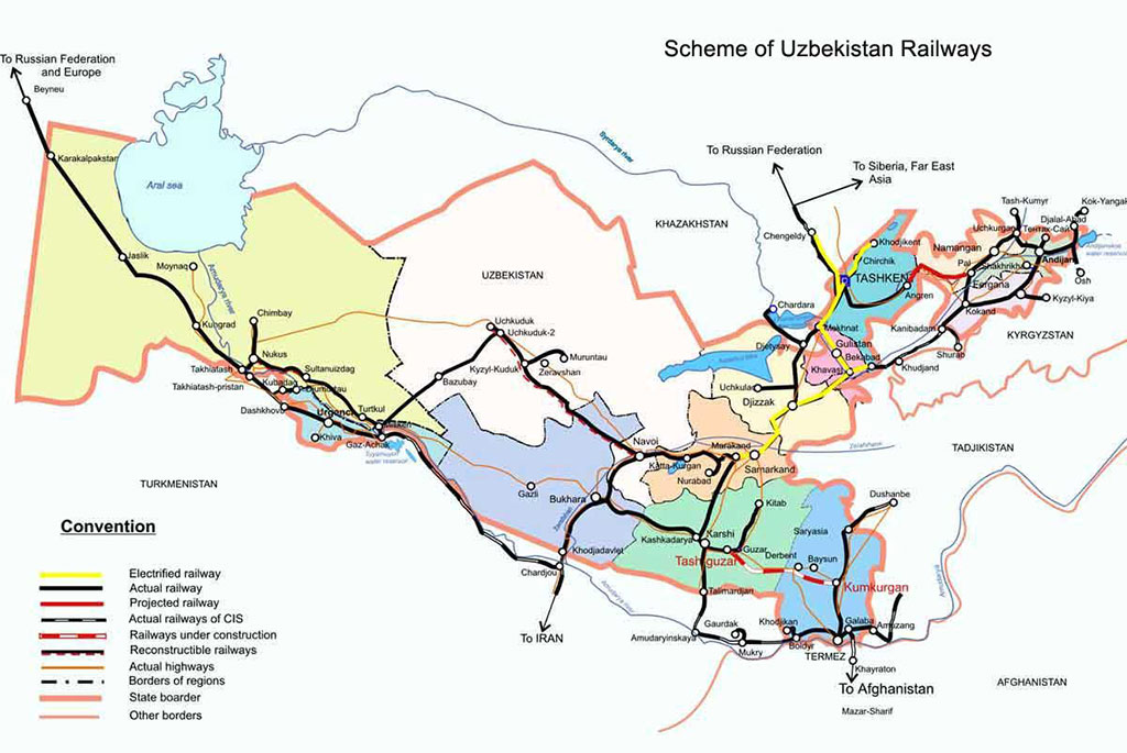 Les trains sont confortables et modernes, avec la climatisation dans les voitures de première et deuxième classe et les tarifs pas chers! Il existe plusieurs trains depuis la capitale Tachkent, reliant Boukhara, Samarcande ou Ourgentch et Khiva. Quelques retards peuvent être à déplorer, comme partout lorsqu’il n’y a qu’une seule voie de circulation. Pour rejoindre Ourguentch le train prendra la direction de Zarafshon et Uchkuduk à partir de Navoï avant d’aller à Boukhara. Il y a aussi un train de nuit de Tachkent a Urgench. Le train Ourguentch – Boukhara fait le trajet une fois par semaine.