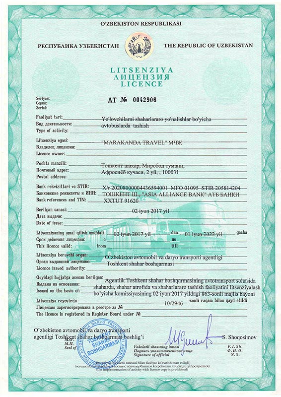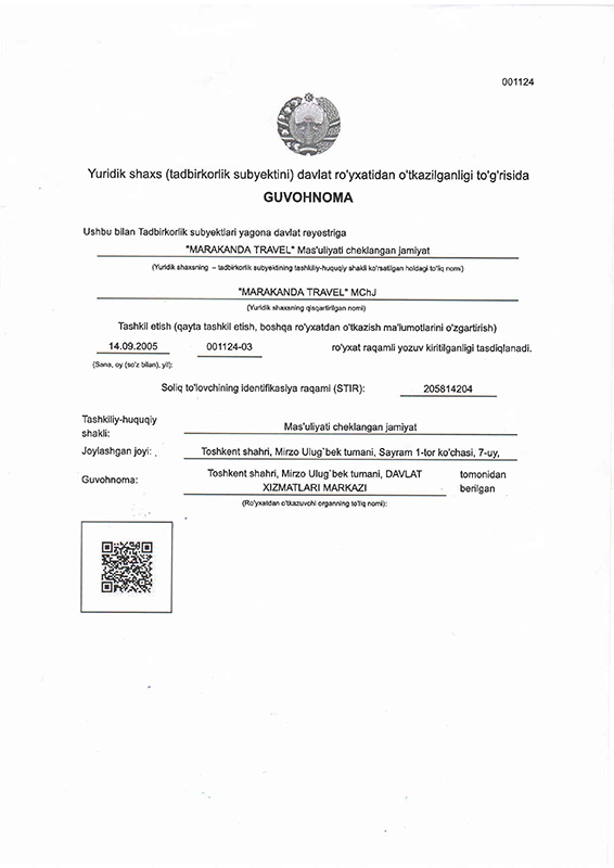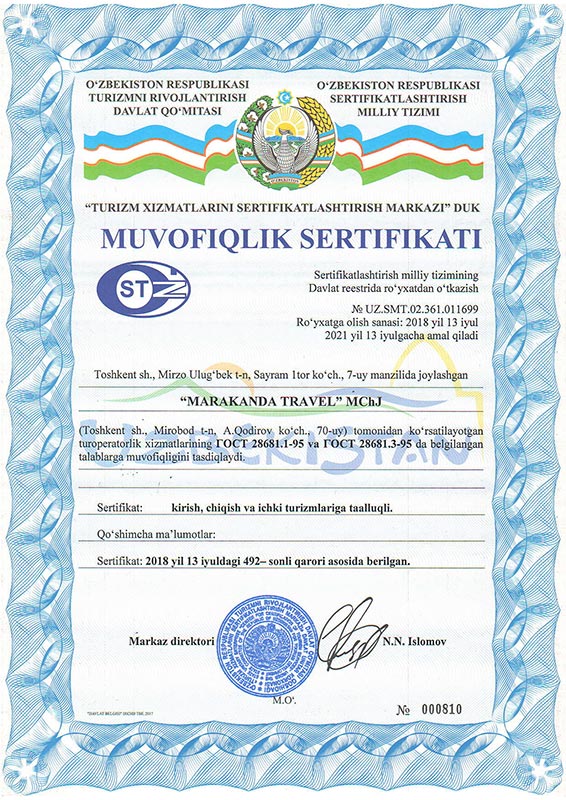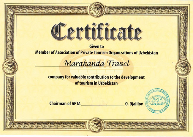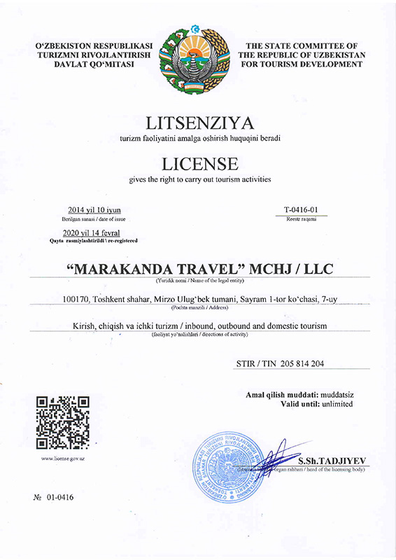 MARAKANDA TRAVEL SARL est une agence touristique réceptive ouzbèque francophone, crée en 2006, spécialisée sur l’Ouzbékistan et l’Asie Centrale (Kirghizistan, Tadjikistan et Turkménistan), domiciliée à Tachkent , la capitale de l’Ouzbékistan et fonctionne sous la licence et le certificat du Ministère de Tourisme. Notre équipe est à votre disposition pour vous faire découvrir l'Asie centrale sous toutes ses facettes. Kamol Aliev, spécialiste du tourisme en Ouzbékistan, ancien professeur de français avec ses guides compétents et assistants vous aideront à découvrir les traditions et la culture des sédentaires et des nomades de la Route de la Soie. Un personnel enthousiaste, qui peut fournir des informations à jour: des invitations pour visas, des circuits sur mesure, des tarifs raisonnables, des guides compétents et un minimum de bureaucratie. S’adresser directement à l’agence permet d’éviter le coût élevé des intermédiaires. Par rapport aux autres agences touristiques locaux, nos services sont plus personnalisés, d`une qualité fiable, flexibles, originales et les prix sont justes et abordables. Notre expérience nous permet de vous présenter des programmes personnalisables suivant vos attentes et vos aspirations.