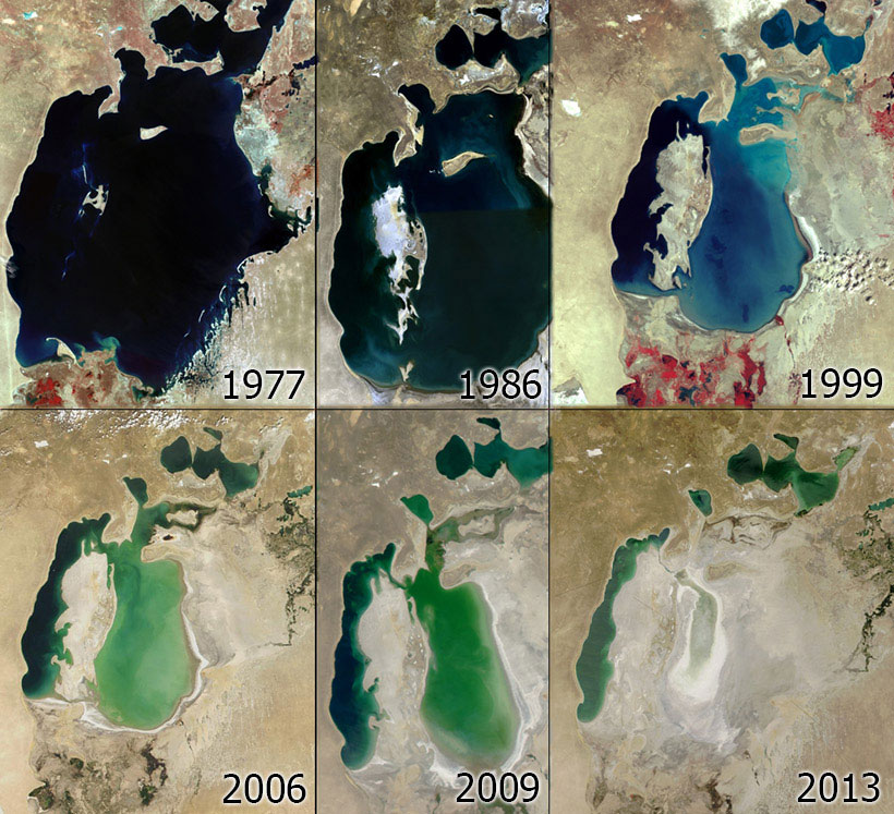 Autrefois, la mer d’Aral était alimentée par deux grands fleuves, le Syr-Daria et l’Amou-Daria qui maintenaient la mer à un niveau stable. De 64 000 Km², il n’en reste aujourd’hui qu’environ 30 000 Km². Au début des années 60, les économistes soviétiques, soucieux de rentabilité, décident d’intensifier la culture du coton en Ouzbékistan et au Kazakhstan. Pour irriguer les cultures, ils font détourner les deux fleuves qui alimentait la mer d’Aral.