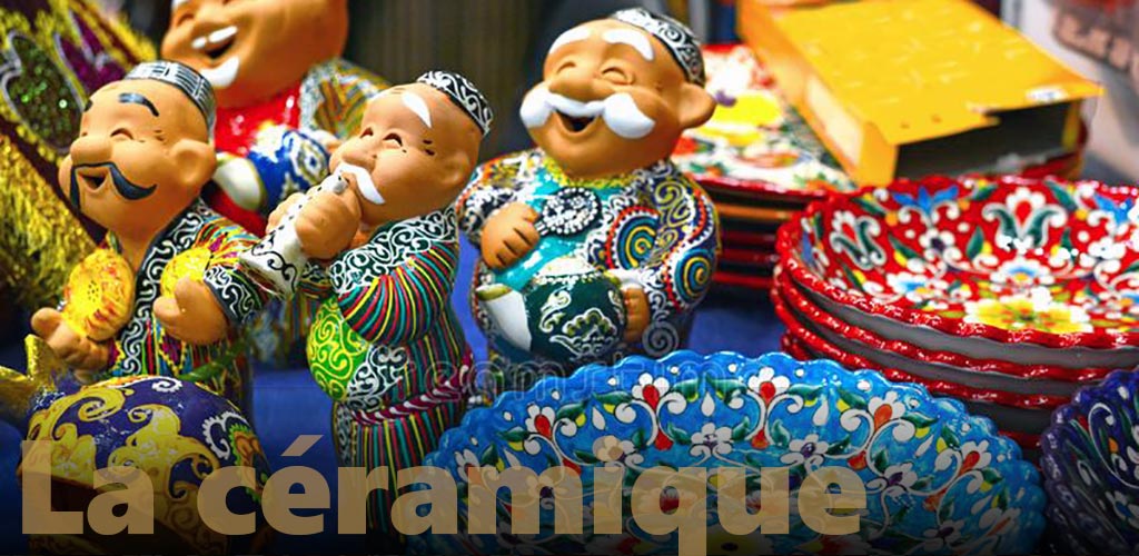 La production des céramiques est un des anciens types de forme d’art décoratif et appliqué en Ouzbékistan. Actuellement Ouzbékistan a trios écoles principales de poterie décorative: l’école de Ferghana (Richtan, Gurumsarai), l’école de Boukhara-Samarkand (Gijdouvan) et l’école de Khorezm. La diversité des formes de la poterie traditionnelle est toujours la même d’une école à l’autre: la soupière, le bol, la grande assiette creuse, le saladier, le seau, le pot et pichet, le casserole et la théière. Cependant l’ornement se diffère avec chaque école qui a son propre et unique style qui peut être reconnu non seulement par des spécialistes mais aussi bien par des acheteurs ordinaires.