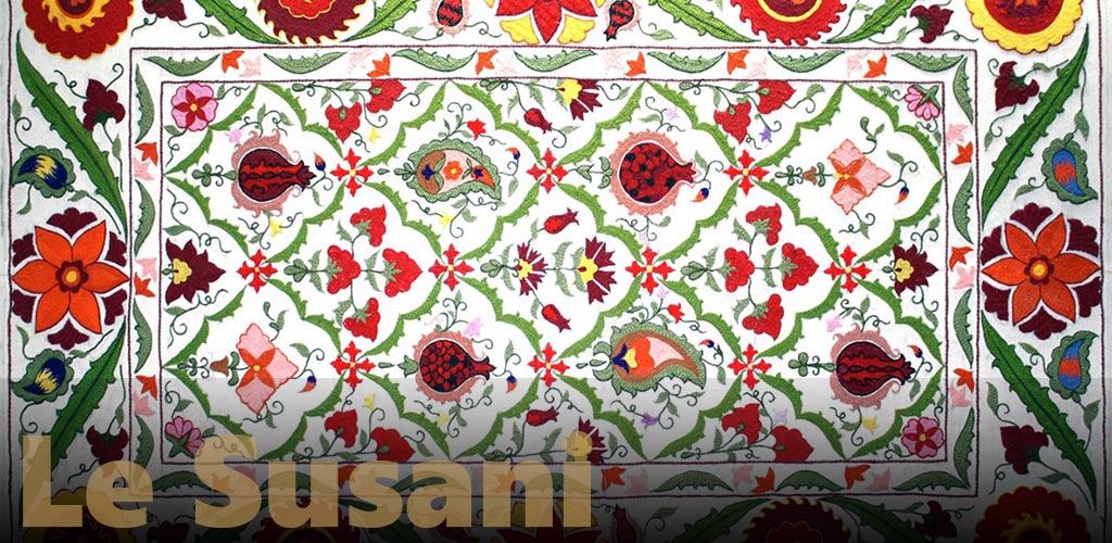 Le susani est un tissu brodé issu de traditions ancestrales d'Asie Centrale (étymologiquement, susani du persan signifie « travail à l'aiguille »). Ces grandes broderies décoratives représentent l'une des branches les plus importantes de l'artisanat ouzbek et on les retrouve dans tous les centres ruraux d'Asie centrale. L'Ouzbékistan, cette république d'Asie centrale située sur la « route de la soie », fut un carrefour historique d'échanges culturels et commerciaux entre l'Orient et l'Occident : situé au coeur de civilisations expertes en nouage de tapis, il développa une véritable culture de la broderie.