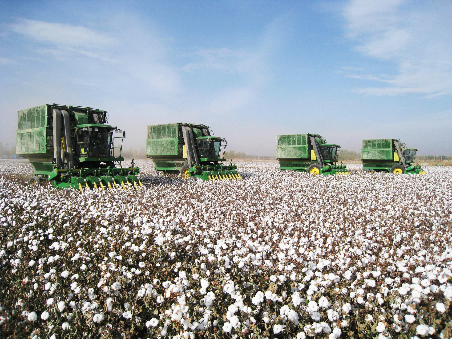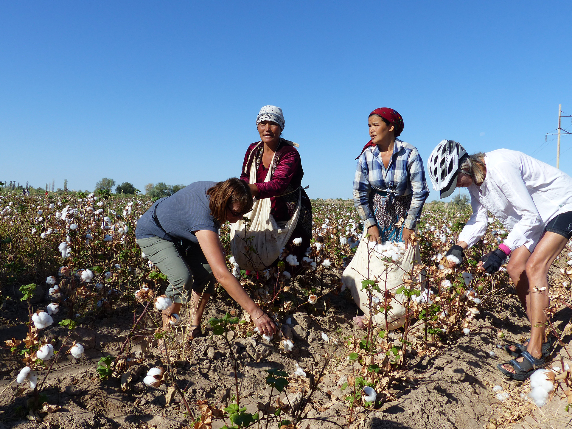 Le coton fait partie de la vie de chaque ouzbek. Tout le monde est concerné, du moins en ce qui concerne la récolte. Le coton est planté en avril. D'abord sous tunnel plastique, il est dés le mois de mai en plein air et au mois d'aout apparaît la fleur. Celle-ci évoluera ensuite sous la forme d'une coque close. Dés les premiers froids, en général fin septembre, la coque explose et le coton apparaît. La récolte se fait en tirant le coton de la coque qui reste sur place. Dans le coton extrait se trouve les graines qui seront séparées des fibres dans les fabriques et qui serviront à faire l'huile de coton. Au moment de la récolte, toute la population est mobilisée. La cueillette se fait chaque jour, dimanche compris. Les coques ne s'ouvrant pas toutes en même temps, et le coton devant être cueilli rapidement après l'ouverture de la coque, trois ou quatre passages à une semaine d'intervalle environ seront nécessaires pour chaque champ. Les cueilleurs ont un grand sac attaché à la ceinture où ils déposent le coton et qu'ils vont vider dans des chariots à haut bord. On peut souvent rencontrer des groupes d'hommes et de femmes attendant les bus de ramassage, ou les cantines improvisées au bord des routes, ou les samovars pour le thé. Il est impressionnant de voir l'activité dans les champs de coton à cette période car il ya vraiment beaucoup de cueilleurs dans les champs. Sur la route, les tracteurs tirent les chariots et vont les vider dans des entrepôts où le coton sera stocké sur des tas plus hauts qu'une maison.