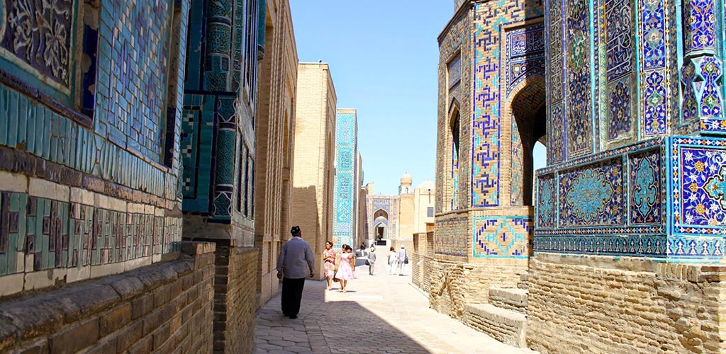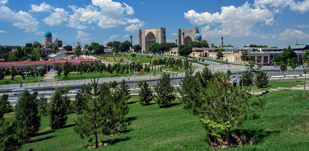 Tout au long de son histoire, la ville a connu grandeur et décadence. Malgré les invasions dévastatrices, la ville s’est toujours relevée pour renaître plus belle encore. Sous le règne d’Amir Timour (Tamerlan), Samarcande connait une période de prospérité et de grandeur. Natif de Chakhrisabz, Amir Timour a fait de Samarkand la capitale de son immense empire. Important carrefour sur la Route de la Soie, la ville avait une situation géographique très avantageuse. La ville de Samarcande conserve de brillants exemples de l’architecture du Moyen âge, qui frappent par leurs formes parfaites et la richesse de leurs couleurs. La place Régistan est l’endroit le plus visité de Samarcande. Elle impressionne ses visiteurs par sa perfection monumentale, son mariage de belles majoliques et de mosaïque azurée. La place Régistan est une des plus belles places du monde. Elle abrite trois universités médiévales (medersa): la medersa Oulougbek, la medersa Tilla-Kari et la medersa Cher-Dor. Située sur la colline d’Afrosiyob, la nécropole Chah-i-Zinda est, avec l’ensemble Bibi-Khanoum, le mausolée Gour-Emir, le tombeau de Tamerlan et de ses descendants et d’autres chefs d’oeuvres de l’architecture l’une des merveilles architecturales de l’Asie Centrale.
