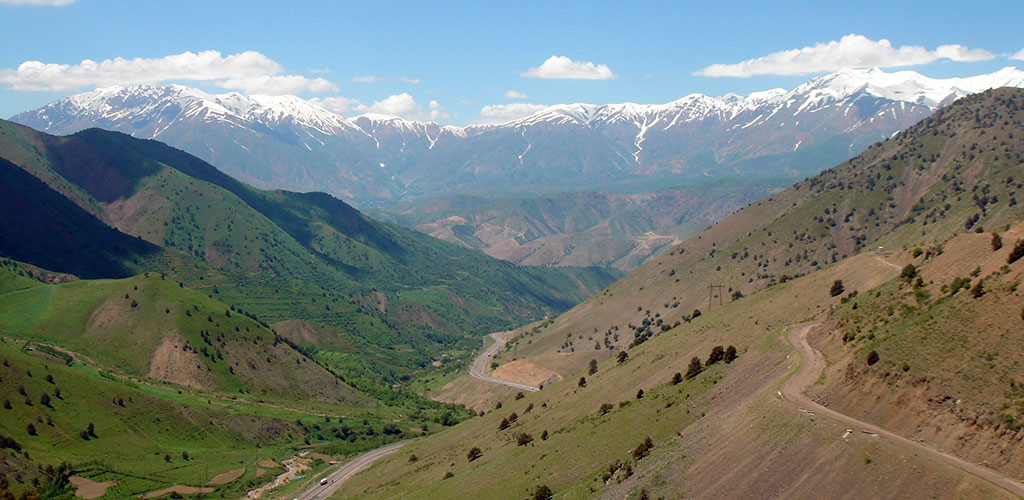 La plupart des véhicules entrent par la route sud, qui passe un col dans les montagnes. Cette nouvelle route redescend la province de Namangan, on traverse un tunnel d’un kilomètre de longueur. On grimpe au dessus d’un superbe lac et on observe les sommets enneigés du Tchatkal, ensuite on traverse les cités d’Angren et d’Almalik avant d’arriver à Tachkent