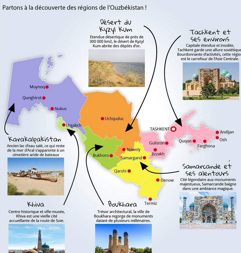 Nous avons des contacts dans l’ensemble de l’Ouzbékistan, et passer par nos services vous garantie un voyage sans intermédiaire et à « prix direct ». Nous pouvons établir des circuits sur un ensemble de thématiques comme en groupe, individuel, famille bien sûr, mais aussi à vélo, des séjours agricoles ou des voyages botaniques, ou des randonnées.