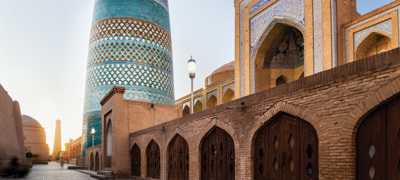 Journée des visites guidées. La ville-musée à ciel ouvert, la Vieille Ville de Khiva, dénommée Itchan Kala classée par l’UNESCO, ancienne escale de la Route de la Soie:  la visite commence par  la Porte Ouest  Ata Darvaza de la vieille ville, Forteresse de Kunya Ark - Madrasa et Minarets de Kalta Minor, Mausolée Sacré de Pakhlavan Makhmoud, Atelier de menuiserie de sculpture sur bois pour découvrir l’artisanat local, Minaret Islam Khoja, palais Tosh Hovli - Harem du Khan; Visite du Palais de Nurulla Bay, les salons officiels d’Isfandyar Khan, construit en 1912. Le Palais se distingue des autres résidences royales de Khiva par son mélange de styles russe et oriental et son ornementation extravagant. Profitez en soirée d’un diner inclu dans un restaurant terrasse jouissant de la plus belle vue sur la ville et ses monuments. Nuit à l’hôtel